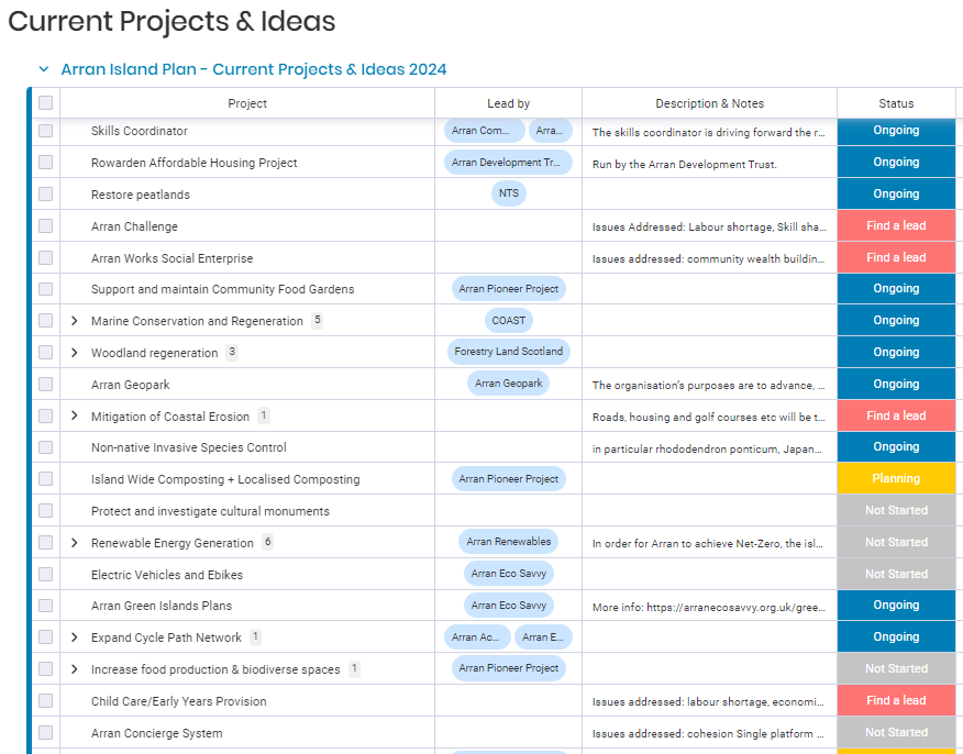 To bridge this gap, we’ve created an interactive listing of all the ideas initiatives that in some way are, or will, contribute to the Arran Island Plan.